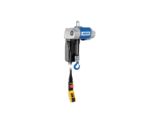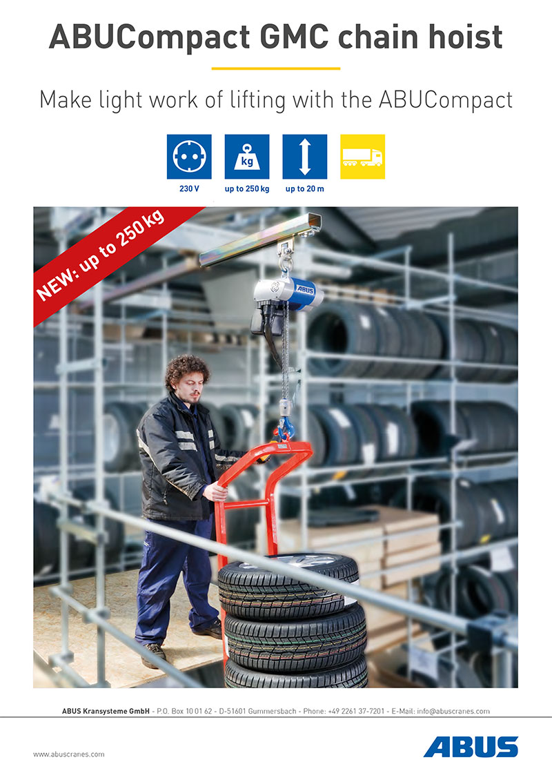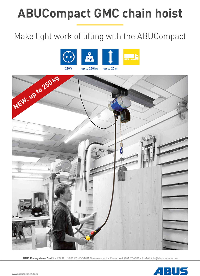 A standard power socket with 230 V suffices for the power supply of the ABUCompact GMC. The GMC is particularly suited to mobile use due to its low weight. The GMC is available with single or double falls and is able to lift loads of up to 125 kg / 250 kg. The lifting speed is infinitely variable. Feasible hook paths reach lengths of up to 20 m / 10 m.